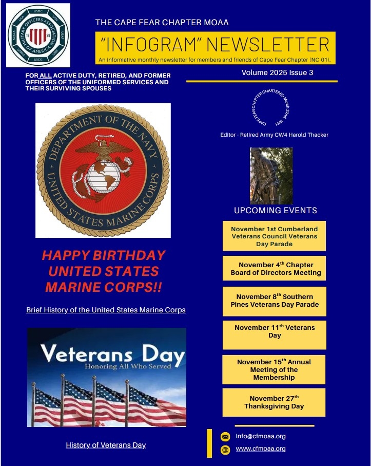 1 Download Cape_Fear_Chapter_November_2025_FINAL.pdf (10 Mb) 1762261505 / 0/ Infogram Nov 2025 The INFOGRAM is the chapter's monthly newsletter in digital format only and distributed electronically each month. Link Tweet Feedback Post Info Posted 11/04/25 08:05 by CFMOAA Under Infogram Permalink 1762261505