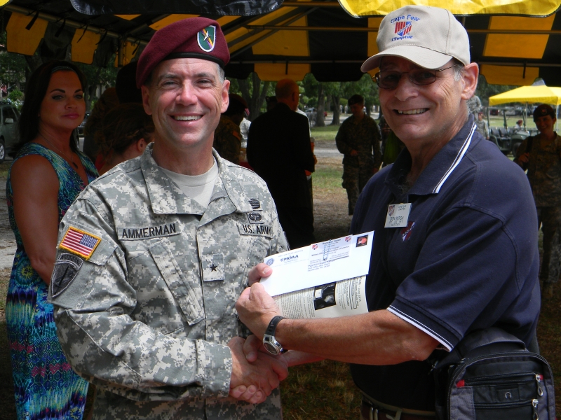Secretary Don Gersh presents BG Daniel R. Ammerman a membership application after assuming command of the US Army Civil Affairs and Psychological Operations Command (Airborne) at Fort Bragg, NC.